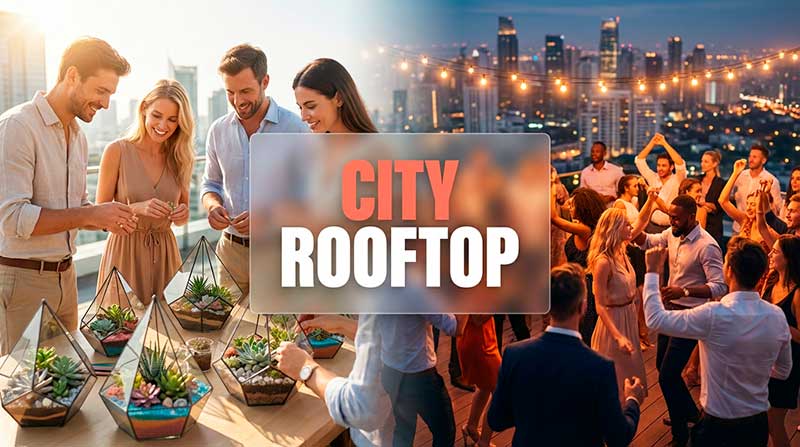 Main zone with city lights and skyline – soft lighting, light fabrics, dried florals and minimalistic accents. Ideal for group and romantic shots.