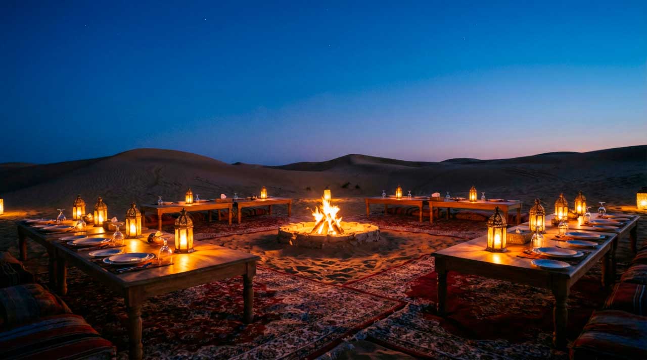 Прибытие в стилизованный лагерь в пустыне, закрытый специально под вашу группу. Никаких посторонних туристов и очередей. Вас встречают традиционно: арабский кофе с кардамоном, финики и легкие закуски. Гости могут расслабиться в лаунж-зоне с коврами и подушками (Majlis), покурить кальян или сделать роспись хной.