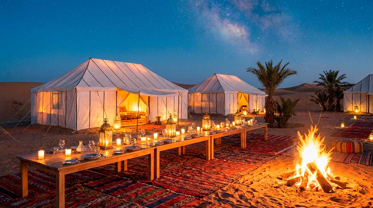 - Welcome: Прибытие в приватный лагерь (Luxury Camp). Встреча традиционным мятным чаем и марокканскими сладостями.