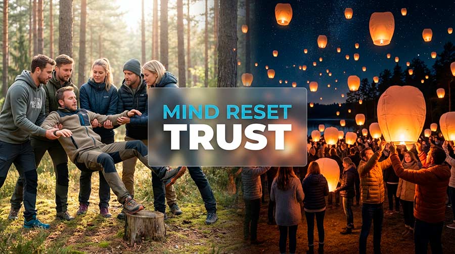 - Зона доверия: Каждый сотрудник должен забраться на постамент и спиной упасть назад, где его ловят его сокомандники.